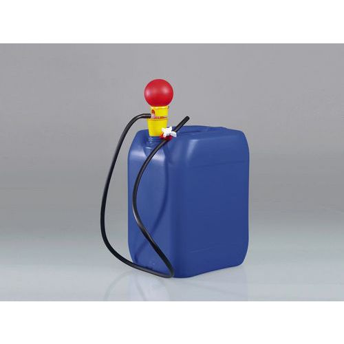 Minikäsipumppu PP-nastalla ja pehmeillä PVC-putkilla. Soveltuu pienille, jopa 10 litran astioille ja Ø 20-36 mm:n putkiaukoille. Toimii useimpien kaupallisten säilytystynnyreiden kanssa.
