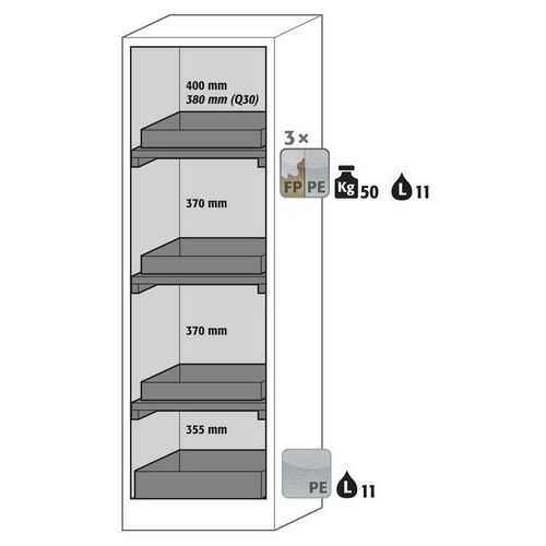 Paloturvakaappi Q-CLASSIC-30. Hyväksytty syttyvien vaarallisten aineiden varastointiin työtiloissa. Toiminta - rakenne. Vankka rakenne ja pitkäikäisyys: kolminkertaisesti saranoitu ovi, kaapin runko valmistettu melamiinihartsista ja tulenkestävistä erikoislevyistä, turvaelementit kootaan varastolokeron ulkopuolella, mikä lisää suojaa syöpymiseltä, ovet metalliedustalla sekä naarmuuntumis- ja iskuvarmalla pinnalla, helppo puhdistaa. Helppo ja mukava käsitellä: ovi pysähtyy mihin tahansa asentoonn, sulkeutuvat itsestään tulipalon sattuessa. Ei valtuuttamatonta käyttöä: ovi lukittavissa profiilisylinterilukolla (integrointi olemassa olevaan lukitusjärjestelmään mahdollista). Helppo kuljetus: integroitu kuljetusjalusta ja irrotettava, valinnainen suojus tai säädettävä tuki jalustan suojuksella. Tuuletus: integroidut ilmaputket, valmiit liitettäväksi (DN 75) tekniseen ilmanpoistojärjestelmään.
