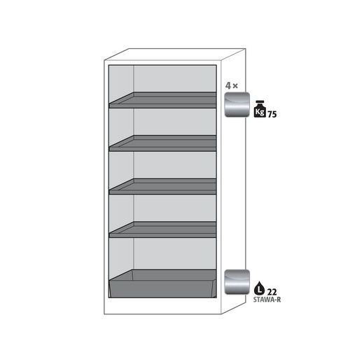 Paloturvakaappi Q-CLASSIC-30. Hyväksytty syttyvien vaarallisten aineiden varastointiin työtiloissa. Toiminta - rakenne. Vankka rakenne ja pitkäikäisyys: kolminkertaisesti saranoitu ovi, kaapin runko valmistettu melamiinihartsista ja tulenkestävistä erikoislevyistä, turvaelementit kootaan varastolokeron ulkopuolella, mikä lisää suojaa syöpymiseltä, ovet metalliedustalla sekä naarmuuntumis- ja iskuvarmalla pinnalla, helppo puhdistaa. Helppo ja mukava käsitellä: ovi pysähtyy mihin tahansa asentoonn, sulkeutuvat itsestään tulipalon sattuessa. Ei valtuuttamatonta käyttöä: ovi lukittavissa profiilisylinterilukolla (integrointi olemassa olevaan lukitusjärjestelmään mahdollista). Helppo kuljetus: integroitu kuljetusjalusta ja irrotettava, valinnainen suojus tai säädettävä tuki jalustan suojuksella. Tuuletus: integroidut ilmaputket, valmiit liitettäväksi (DN 75) tekniseen ilmanpoistojärjestelmään. Valmistettu Saksassa Maks kuormitus (kg) : 600 kg
