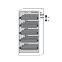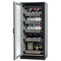 Paloturvakaappi Q-DISPLAY-30. Hyväksytty syttyvien vaarallisten aineiden varastointiin työtiloissa. Toiminta - rakenne. Vankka rakenne ja pitkäikäisyys: kolminkertaisesti saranoitu ovi, kaapin runko valmistettu melamiinihartsista ja tulenkestävistä erikoislevyistä, turvaelementit kootaan varastolokeron ulkopuolella, mikä lisää suojaa syöpymiseltä, ovet metalliedustalla sekä naarmuuntumis- ja iskuvarmalla pinnalla, helppo puhdistaa. Kaikki säiliöt yhdellä silmäyksellä: ovi, jossa on suuri lasinen leikkaus auttaa nopeassa ja helpossa varastoitujen säiliöiden yleiskatsauksessa - jopa suljettujen ovien läpi. Helppo ja mukava käsitellä: ovi pysähtyy mihin tahansa asentoonn, sulkeutuvat itsestään tulipalon sattuessa. Ei valtuuttamatonta käyttöä: ovi lukittavissa profiilisylinterilukolla (integrointi olemassa olevaan lukitusjärjestelmään mahdollista). Helppo kuljetus: integroitu kuljetusjalusta ja irrotettava, valinnainen suojus tai säädettävä tuki jalustan suojuksella. Tuuletus: integroidut ilmaputket, valmiit liitettäväksi (DN 75) tekniseen ilmanpoistojärjestelmään. Valmistettu Saksassa Maks kuormitus (kg) : 600 kg
