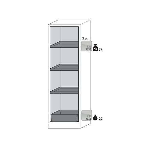 Paloturvakaappi Q-PEGASUS-90. Hyväksytty syttyvien vaarallisten aineiden varastointiin työtiloissa. Toiminta - rakenne. Vankka rakenne ja pitkäikäisyys: kolminkertaisella saranalla varustettu ovi, vankka rakenne, turvaelementit kootaan varastolokeron ulkopuolella, mikä lisää suojaa syöpymiseltä, naarmutus- ja iskunkestävä pinta, helppo puhdistaa. Käyttäjäystävällinen ja turvallinen: avoimen oven pysäytysjärjestelmä (vakio) mahdollistaa kätevän ja turvallisen astioiden ottamisen tai kaappiin laittamisen. Aina suljettu: sarja-automaattinen ovien sulkeutuminen (TSA) vapauttaa pysäytetyn oven n. 60 sekunnin jälkeen, akustinen ja visuaalinen signaali ennen sulkemista. Ei valtuuttamatonta käyttöä: ovi lukittavissa sylinterilukolla (integrointi olemassa olevaan lukitusjärjestelmään mahdollista), lukitustilan merkkivalo (punainen-vihreä). Helppo kuljetus: integroitu kuljetusjalusta ja irrotettava, valinnainen jalustan suojus. Helppo tasaus: säätöjalat lattian epätasaisuuden kompensoimiseksi. Tuuletus: integroidut ilmaputket, valmiit liitettäväksi (DN 75) tekniseen ilmanpoistojärjestelmään, syöksykierteet pakoristikossa riittävän teknisen tuuletuksen merkkinä. Valmistettu Saksassa Maks kuormitus (kg) : 600 kg