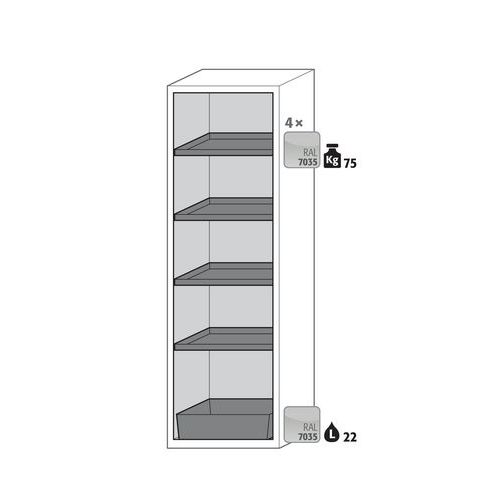 Paloturvakaappi S-CLASSIC-90. Hyväksytty syttyvien vaarallisten aineiden varastointiin työtiloissa. Toiminta - rakenne. Vankka rakenne ja pitkäikäisyys: kolmisaranaisnen ovi, runko valmistettu pulveripäällyksisestä teräslevystä, turvaelementit kootaan kaapin ulkopuolella, mikä lisää suojaa syöpymiseltä, helppo puhdistaa. Käyttäjäystävällinen ja turvallinen (malli. WDAS): avoimen oven pysäytysjärjestelmä, mahdollistaa kätevän ja turvallisen astioiden ottamisen tai kaappiin laittamisen. Ei valtuuttamatonta käyttöä: ovi lukittavissa profiilisylinterilukolla (integrointi olemassa olevaan lukitusjärjestelmään mahdollista). Helppo tasaus: säätöjalat lattian epätasaisuuden kompensoimiseksi. Tuuletus: integroidut ilmaputket, valmiit liitettäväksi (DN 75) tekniseen ilmanpoistojärjestelmään. Valmistettu Saksassa