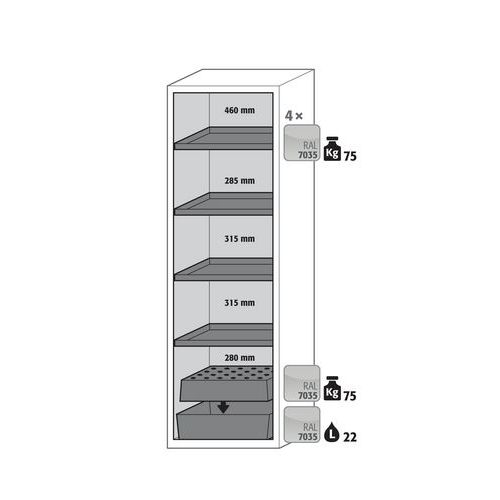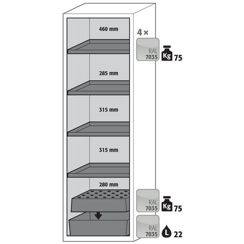 Paloturvakaappi S-CLASSIC-90. Hyväksytty syttyvien vaarallisten aineiden varastointiin työtiloissa. Toiminta - rakenne. Vankka rakenne ja pitkäikäisyys: kolmisaranaisnen ovi, runko valmistettu pulveripäällyksisestä teräslevystä, turvaelementit kootaan kaapin ulkopuolella, mikä lisää suojaa syöpymiseltä, helppo puhdistaa. Käyttäjäystävällinen ja turvallinen (malli. WDAS): avoimen oven pysäytysjärjestelmä, mahdollistaa kätevän ja turvallisen astioiden ottamisen tai kaappiin laittamisen. Ei valtuuttamatonta käyttöä: ovi lukittavissa profiilisylinterilukolla (integrointi olemassa olevaan lukitusjärjestelmään mahdollista). Helppo tasaus: säätöjalat lattian epätasaisuuden kompensoimiseksi. Tuuletus: integroidut ilmaputket, valmiit liitettäväksi (DN 75) tekniseen ilmanpoistojärjestelmään. Valmistettu Saksassa