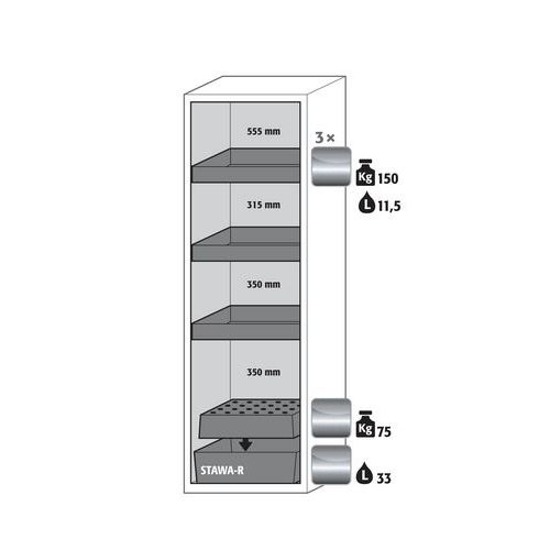Paloturvakaappi S-PHOENIX-90. Hyväksytty syttyvien vaarallisten aineiden varastointiin työtiloissa. Toiminta - rakenne. Vankka rakenne ja pitkäikäisyys: kolmisaranaisnen ovi, runko valmistettu pulveripäällyksisestä teräslevystä, turvaelementit kootaan kaapin ulkopuolella, mikä lisää suojaa syöpymiseltä, helppo puhdistaa. Kaksi yhdessä: 2 lokeroa (vaakasuoraan erotettuna) sallivat syttyvien nesteiden ja aggressiivisten kemikaalien varastointi samassa kaapissa. Tilaa säästävä haitariovi: tarvitsevat vähemmän tilaa kaapin etupuolella kaapin oven ollessa auki. Käyttäjäystävällinen ja turvallinen: avoimen oven pysäytysjärjestelmä (vakio) mahdollistaa kätevän ja turvallisen astioiden ottamisen tai kaappiin laittamisen. Ei valtuuttamatonta käyttöä: ovi lukittavissa profiilisylinterilukolla (integrointi olemassa olevaan lukitusjärjestelmään mahdollista). Helppo tasaus: säätöjalat lattian epätasaisuuden kompensoimiseksi. Tuuletus: integroidut ilmaputket, valmiit liitettäväksi (DN 75) tekniseen ilmanpoistojärjestelmään Valmistettu Saksassa Takuu (vuosia) : 5 vuotta Maks kuormitus (kg) : 600 kg